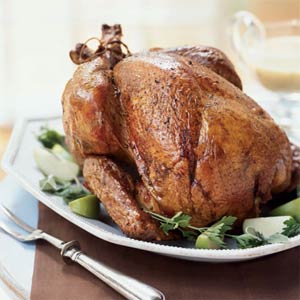 3. Place turkey, breast side up, on a metal grate inside a large roasting pan. Arrange pan on the prepared grill. Grill 2 to 3 hours, to an internal thigh temperature of 180 degrees F (85 degrees C). Remove turkey from grill and let stand 15 minutes before carving.
