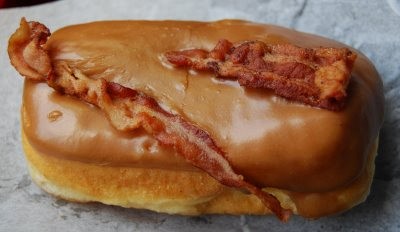 What's better than a fresh made, gooey doughnut? Give up? How about a fresh made, gooey doughnut with meat on it! Ladies and gentlemen...I give you the Maple Bacon Bar! This obvious gift from the meat gods was created by the devious minds behind Voodoo Donuts in Potland, Or.