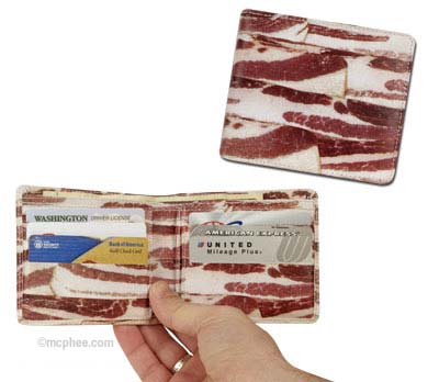 "Put some hip into your hip pocket with a whimsical Bacon Wallet! Great for bringing home the bacon (sorry). Sleek, yet meaty".Get your own bacon wallet here.
