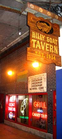 The original Billy Goat Tavern location was "born" in 1934 when Greek immigrant, William "Billy Goat" Sianis, purchased the Lincoln Tavern. Billy Goat bought the tavern for $205, with a check that bounced but was later repaid with sales from the first weekend. The tavern was located across from the Chicago Stadium (now United Center) and attracted mainly sports fans. Sianis became known as "Billy Goat," when a goat fell off a passing truck and wandered inside. Sianis adopted the goat, grew a goatee, acquired the nickname "Billy Goat," and changed the name of the bar to the Billy Goat Tavern.